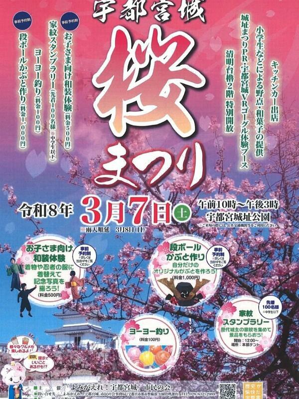 | 内容 | ◎和装体験・着物や忍者の服に着替えて記念撮影・500円(事前予約制・お子さま向け) ●段ボールかぶと作り・自分だけのオリジナル兜を作成・1,000円(事前予約制) ■家紋スタンプラリー・歴代城主の家紋を集めて景品ゲット・先着100名(中学生以下)/ 12:00〜 ★ヨーヨー釣り・お祭りの定番遊び・100円 ◯VRゴーグル体験宇都宮城のVR体験ブース 「特別開放」清明台櫓(せいめいだいやぐら)の2階・普段入れない場所の特別公開 |